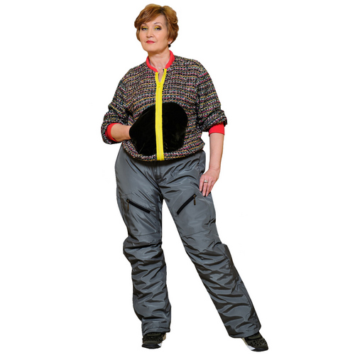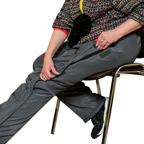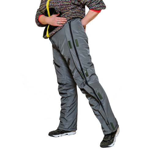 Брюки свободные в области талии и бедер, зауженные к низу, на подкладке. В боковые швы брюк вставлены разъемные молнии, обеспечивающие раскрываемость брючины и удобство одевания для людей, пользующихся креслом-коляской (во взрослых моделях молнии раскрываются либо по всей длине).
